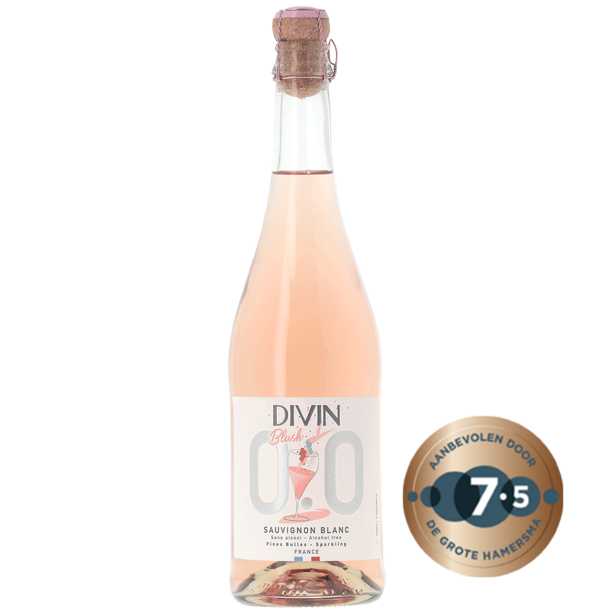 Deze alcoholvrije rosé bubbel van Divin heet officieel ‘Blush’. Gemaakt van Sauvignon Blanc druiven uit de Loire, met een klein beetje Pinot Noir. In de mond een fruitige sensatie; rondheid en frisheid zorgen voor een aangename balans.